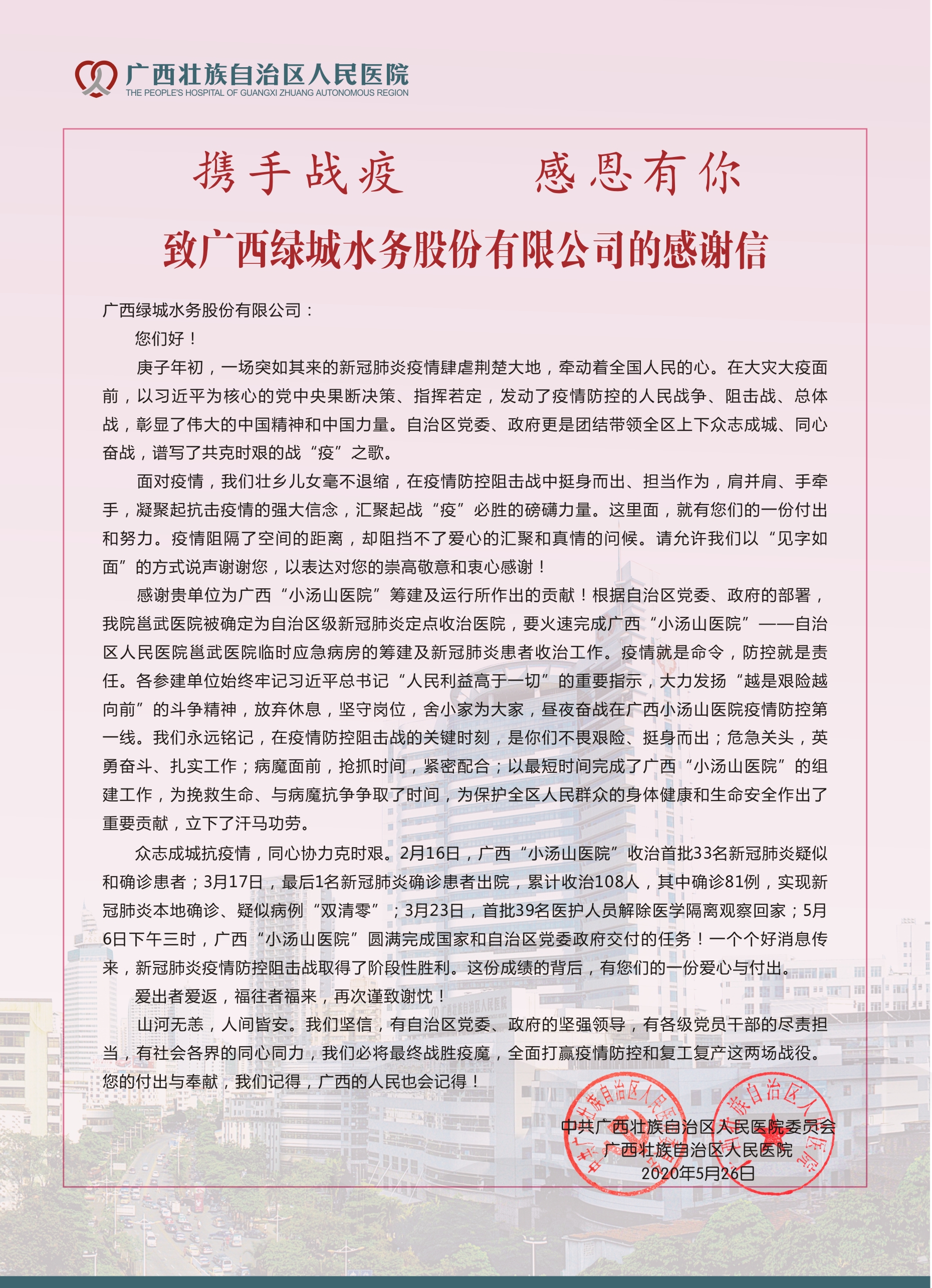 (圖為自治區(qū)人民醫(yī)院發(fā)來(lái)的感謝信)