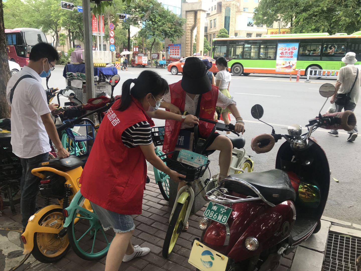 共享單車為居民提供了便利,唱響了綠色出行的理念,然而亂停亂放、隨意毀壞等現(xiàn)象接踵而來(lái),成了靚麗風(fēng)景線上一抹不文明的色彩。青秀區(qū)津頭路口周邊都是老舊小區(qū),道路狹窄,交通擁擠,共享單車隨便擺放的問(wèn)題比較嚴(yán)重。凌鐵水廠的志愿者們充分發(fā)揚(yáng)了不怕臟、不怕累、不怕苦的工作作風(fēng),在青秀區(qū)街頭開展“”共享單車隨手扶志愿活動(dòng)”,對(duì)主干道出現(xiàn)共享單車扎堆、占道、歪倒的情況,他們會(huì)將車扶好,排放整齊,而對(duì)于一些零散停放的車,他們便集中搬到一個(gè)地方排好。